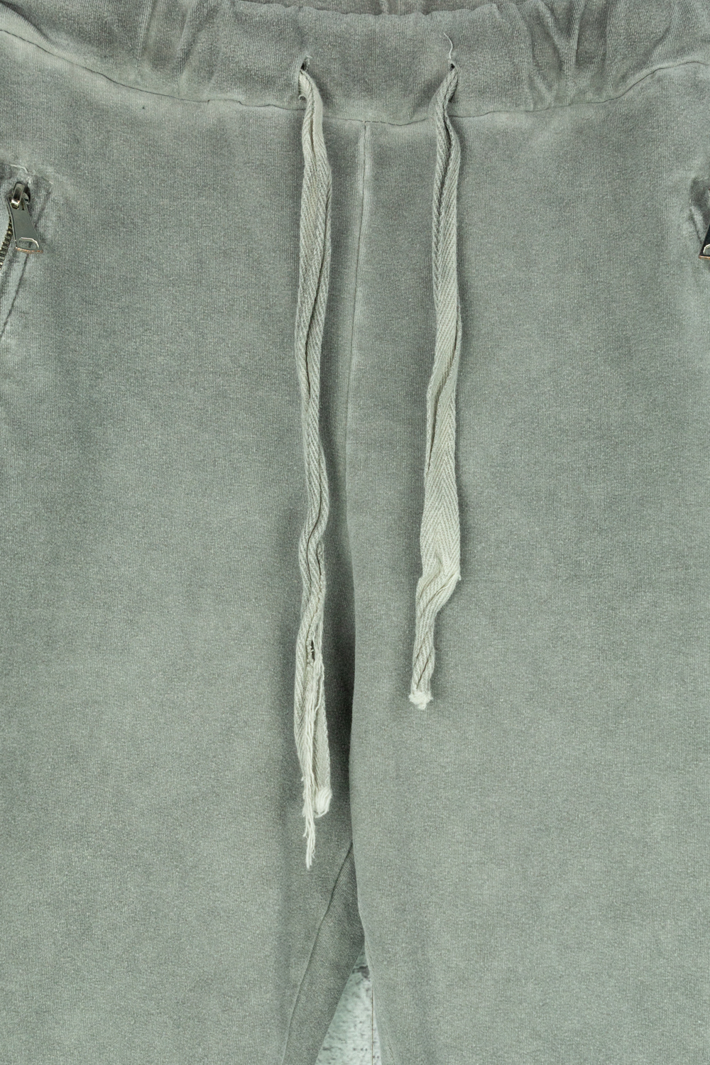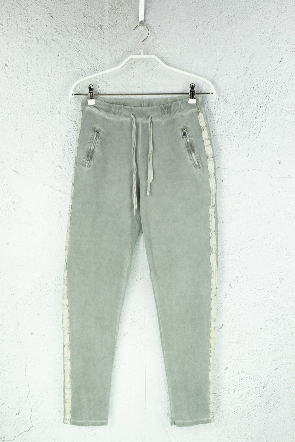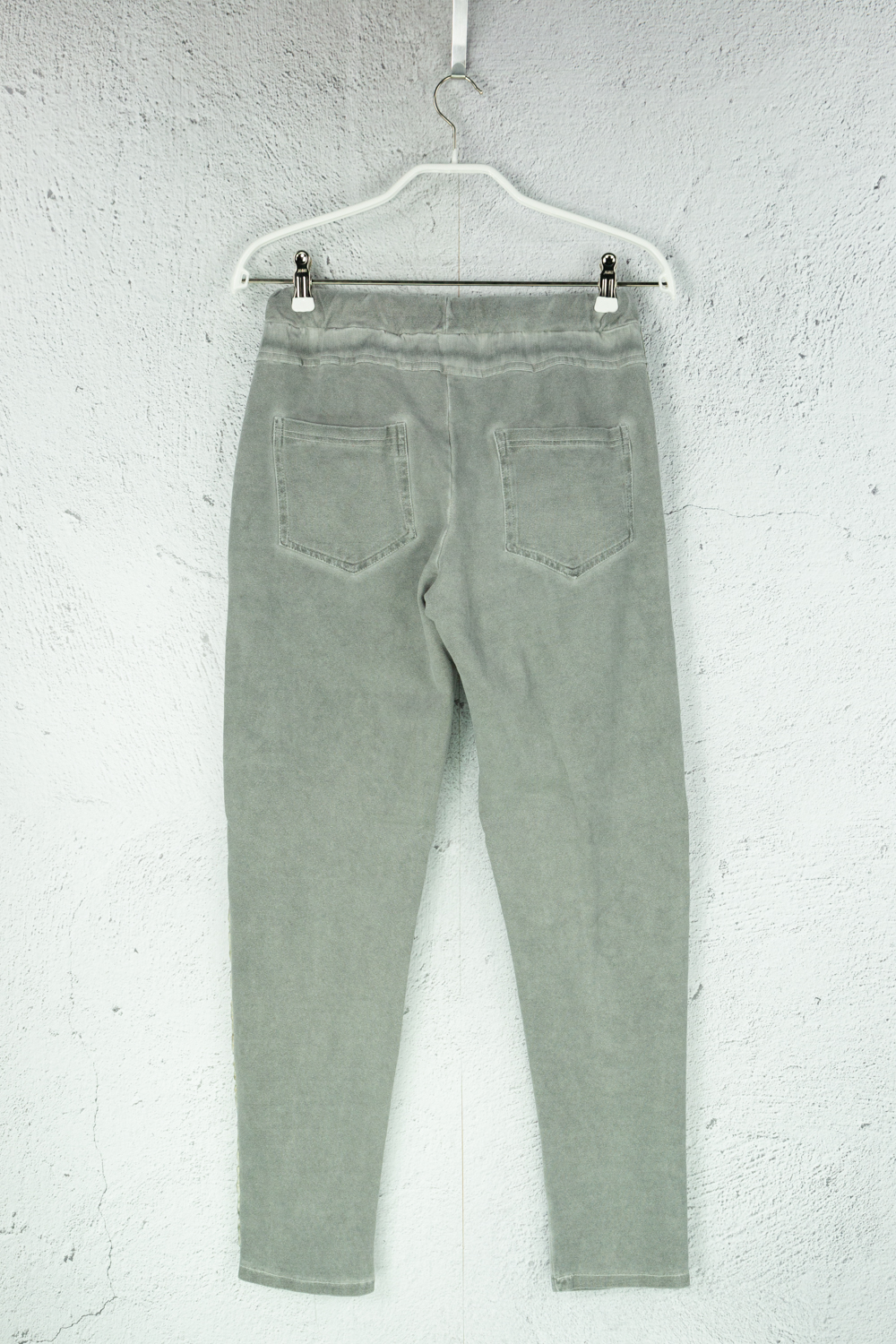 Graue Stoffhose mit elastischem Bund und Applikationen mehr