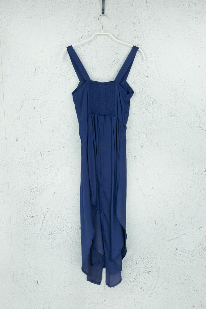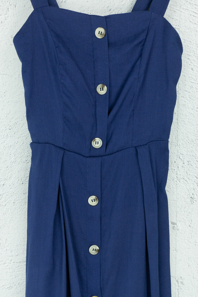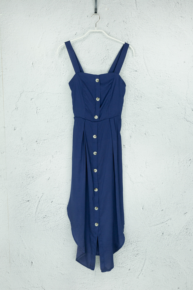 Dunkelblaues Maxikleid mit Trägern und Knöpfen an Front