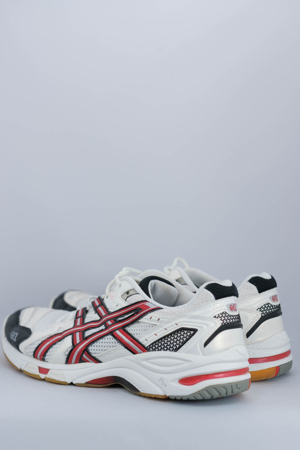 Weisse Sportschuhe mit roten und schwarzen Streifen mehr
